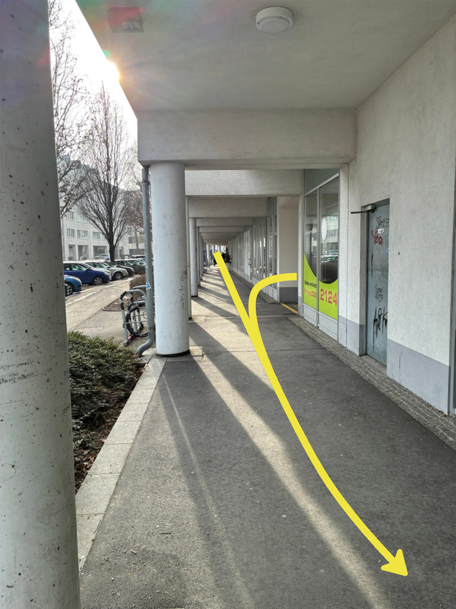 - Rechts am Pavillon vorbei Richtung Straßenbahn gehen.
